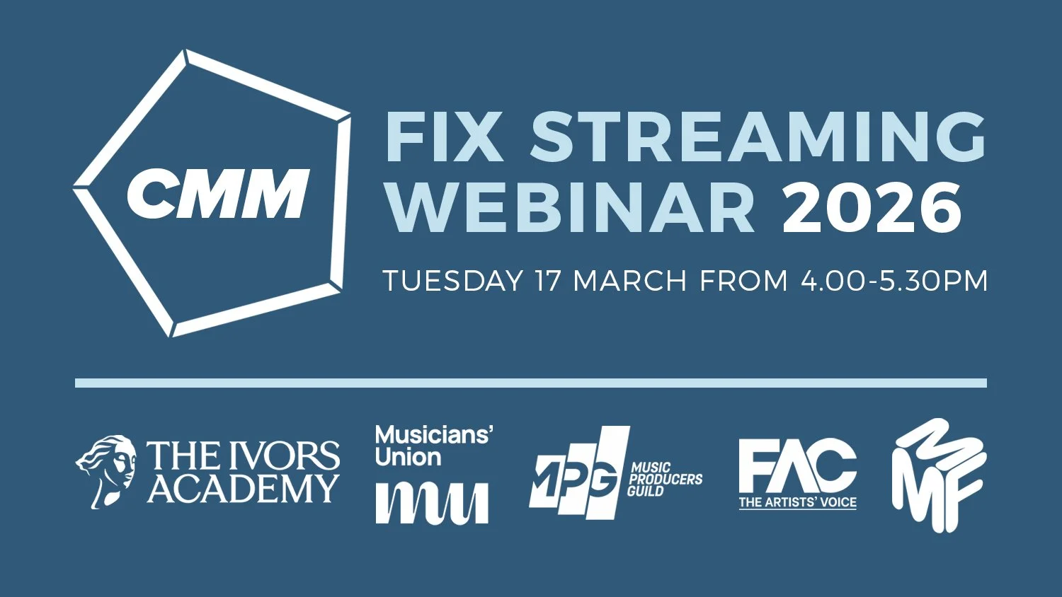 This is a free webinar from the Council Of Music Makers for members of the Featured Artists Coalition, The Ivors Academy, the Musicians’ Union, the Music Producers Guild and the Music Managers Forum on the economics of music streaming.